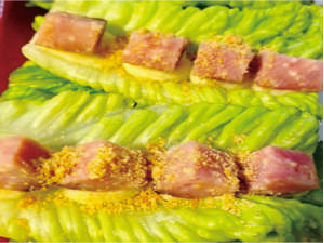 6.ロメインレタスをボート状に整えて並べます。その上に4のポテトベースを絞り出し、角切りにしたソーセージをのせます。仕上げにピーナッツ粉、パクチー、マヨネーズをあしらい、最後に七味唐辛子を振れば完成です。